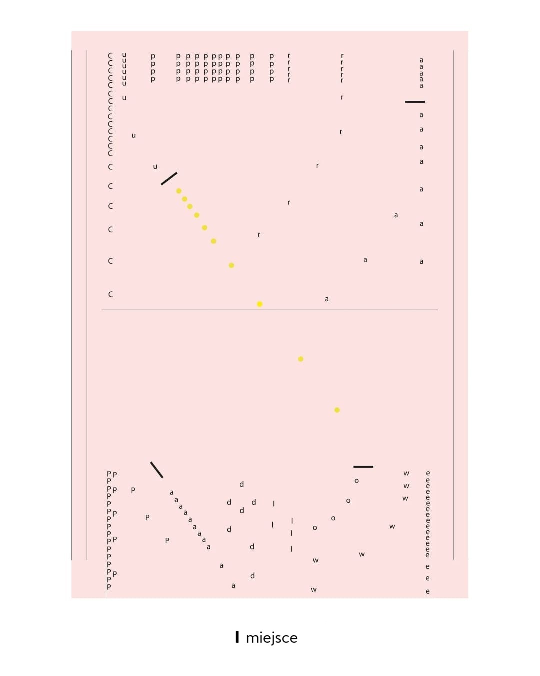 Praca Martyny Chróst wyróżnia się konsekwentnym minimalizmem i dojrzałością formalną. Autorka operuje ograniczoną paletą barwną – czernią i bielą – budując kompozycję niemal abstrakcyjną, opartą na subtelnej strukturze typograficznej. Plakat wymaga uważnego spojrzenia; dopiero po chwili odsłania zawarte w nim elementy odnoszące się do zasad gry i dynamiki padla.